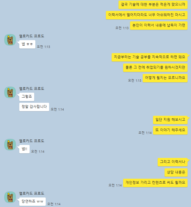 하지만 기술이 부족한건 사실이기 때문에 이력서에서 떨어지더라도 너무 아쉬워하면 안된다는 점과, 본인이 이력서 자체에 대해 납득이 가는 내용이고 개선할 부분이 없다고 생각한다면 지금부터는 기술공부를 지속적으로 해나가면 된다는 점을 알려드렸어요.