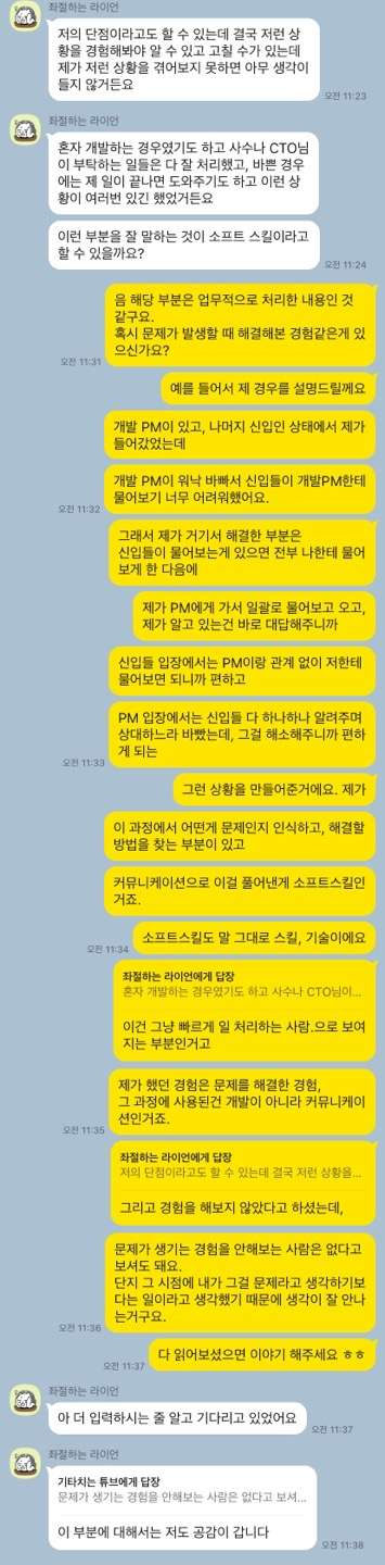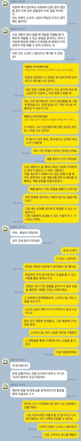 주말에 담당하던 부분에서 급한 일이 생긴 경우나 신입 개발자가 더 좋은 방법을 알려주는건 소프트스킬이라고는 할 수 있지만...