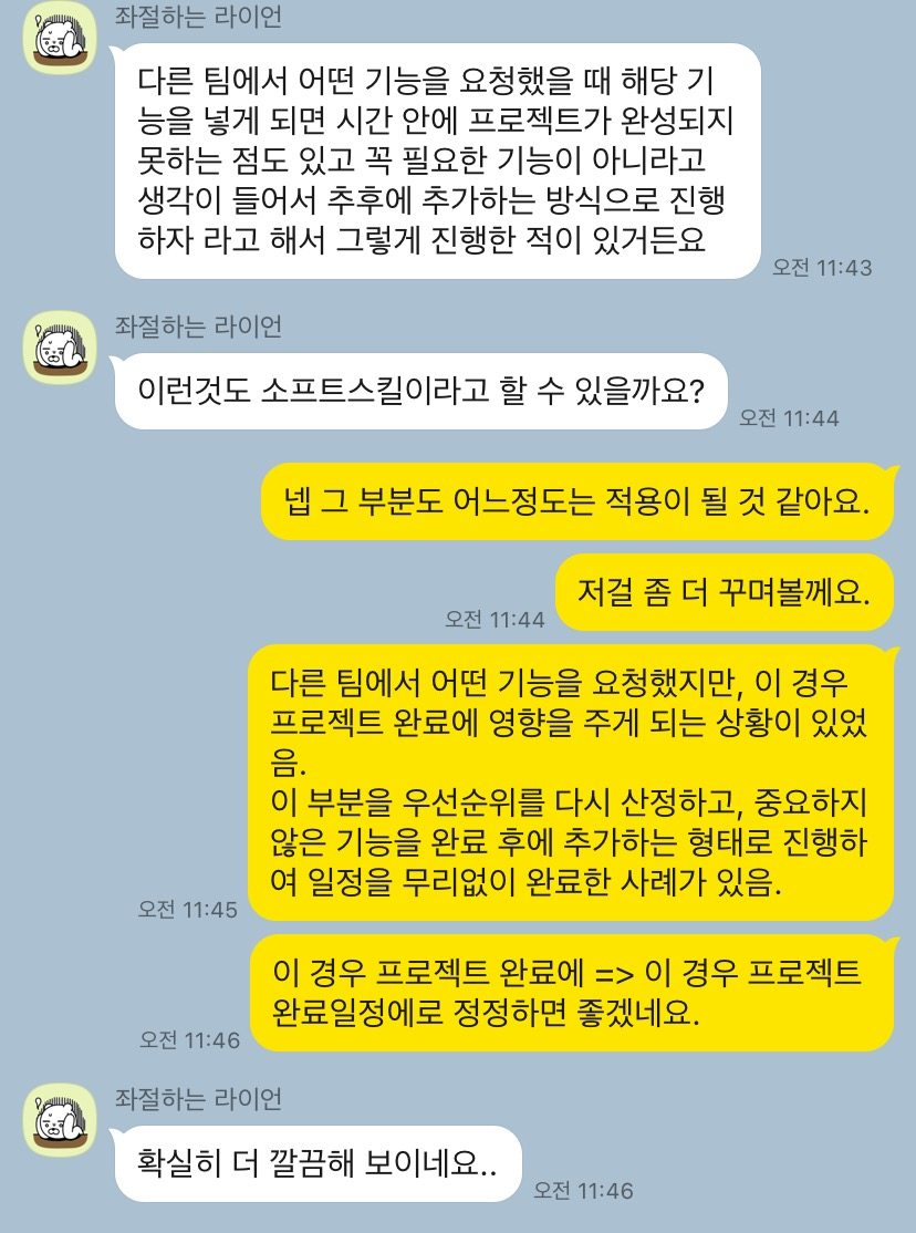 또 다른 경험을 이야기 해주셨는데 해당 케이스는 "시간이 한정적이다."가 문제이고, 이걸 "대화"라는 수단으로 문제를 해결한 사례에요.