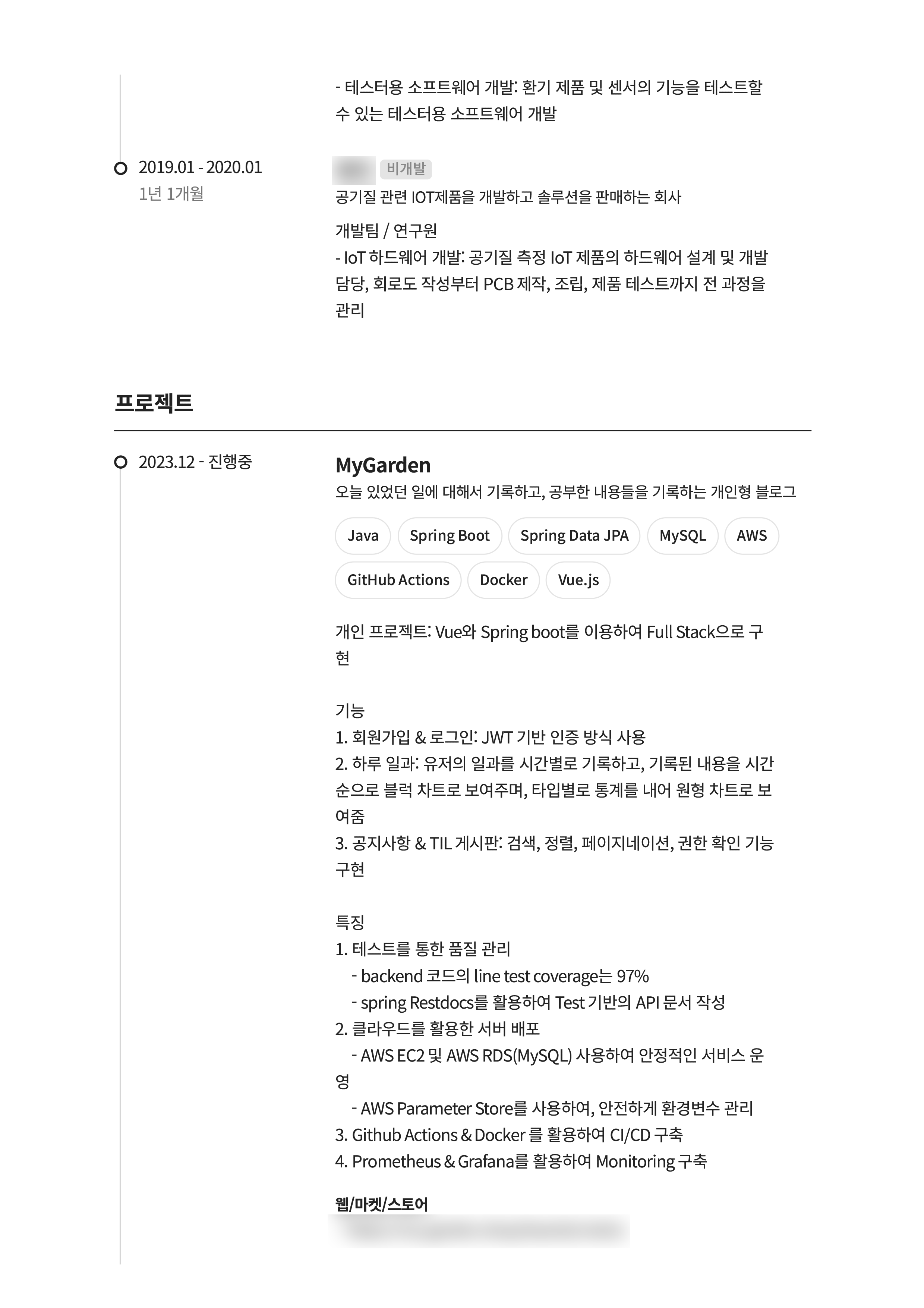 기술스택은 무난하지만, 펌웨어 개발자에서 갑자기 백엔드 개발자로 전향하게 된 이유나, 프로젝트에 적힌 내용이 기술스택밖에 없다는 점.