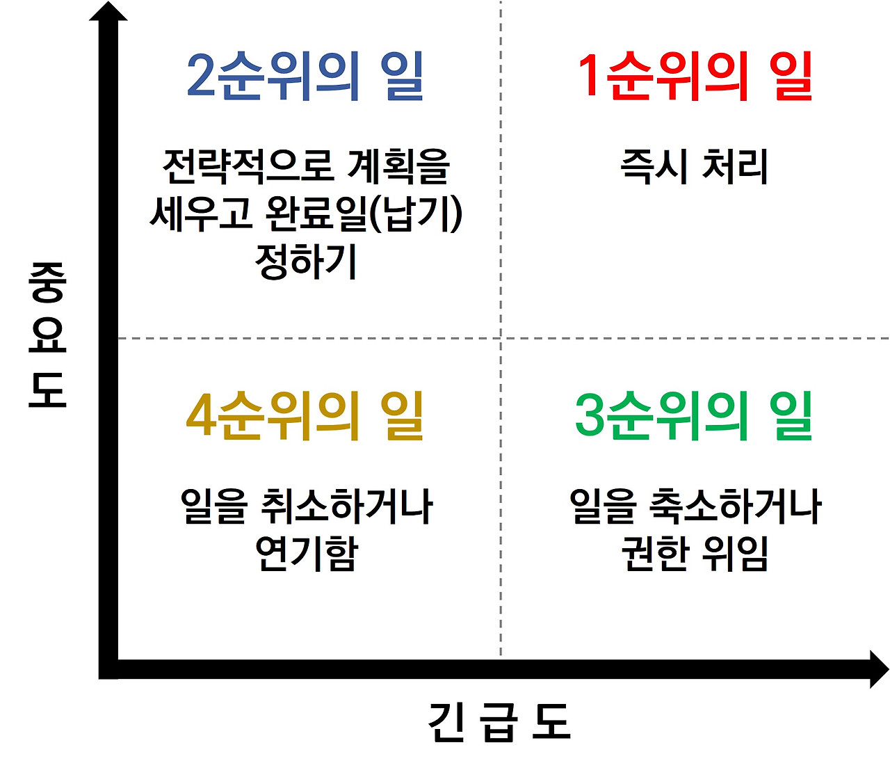 단, 모든 것을 계획하는 것이 아니라, 중요한고 긴급한 것, 중요하고 긴급하지 않은 것 두 가지에 초점을 맞추고,