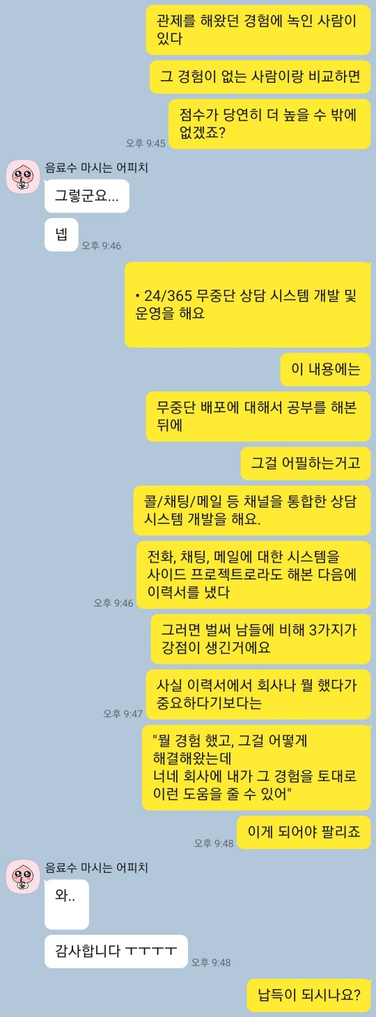 예를 들어 사연자 분의 경우에는 "24/365 무중단 상담 시스템 개발 및 운영을 해요"라는 부분을 무중단 배포 + 관제 시스템과 엮어볼 수도 있을거고, 자격요건상의 "업무 영역 확장에 의지가 강하신 분이면 좋아요"의 경우도 여러가지 업종을 겪어본 경험을 살려서 이야기해볼 수 있겠죠.