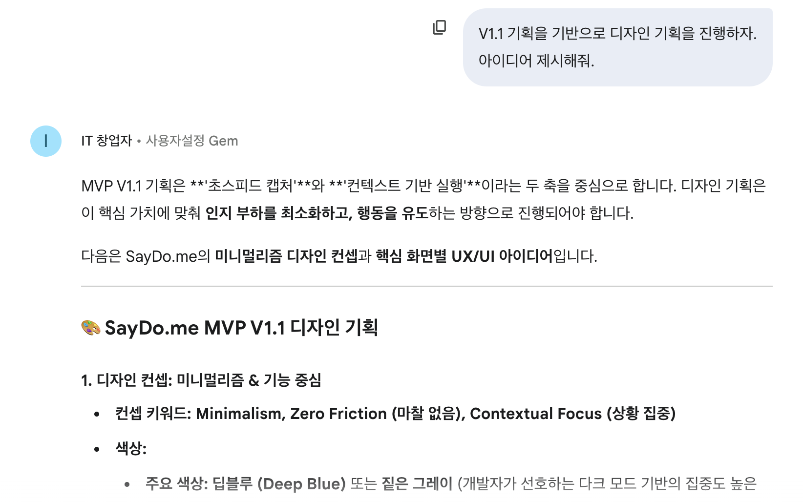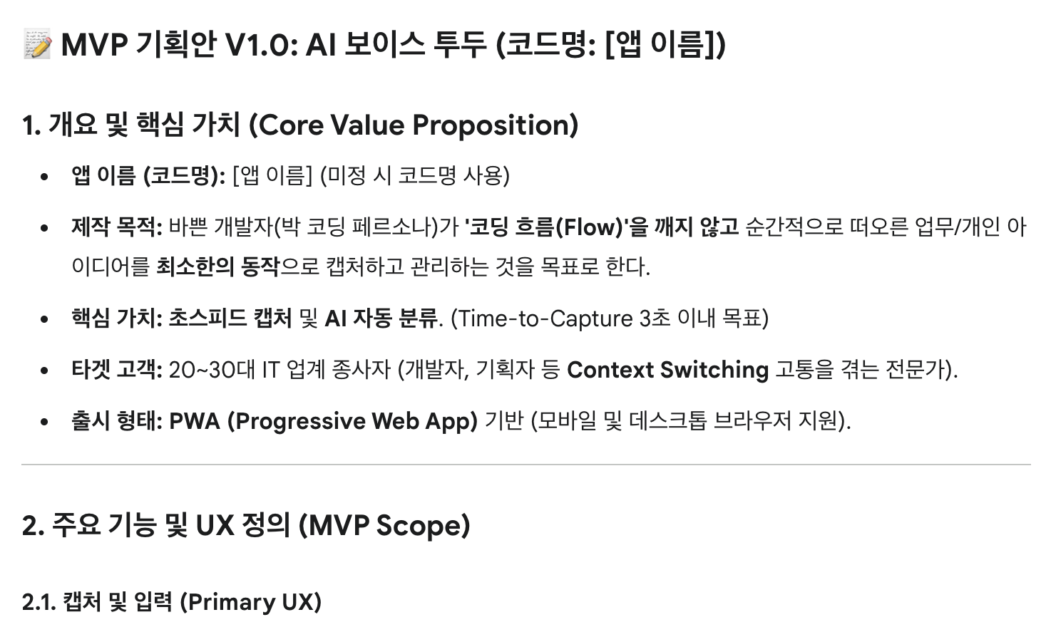 이렇게 만들어진 Gem을 통해 Gemini와 토론을 하여 MVP V1.0 기획을 작성했다.