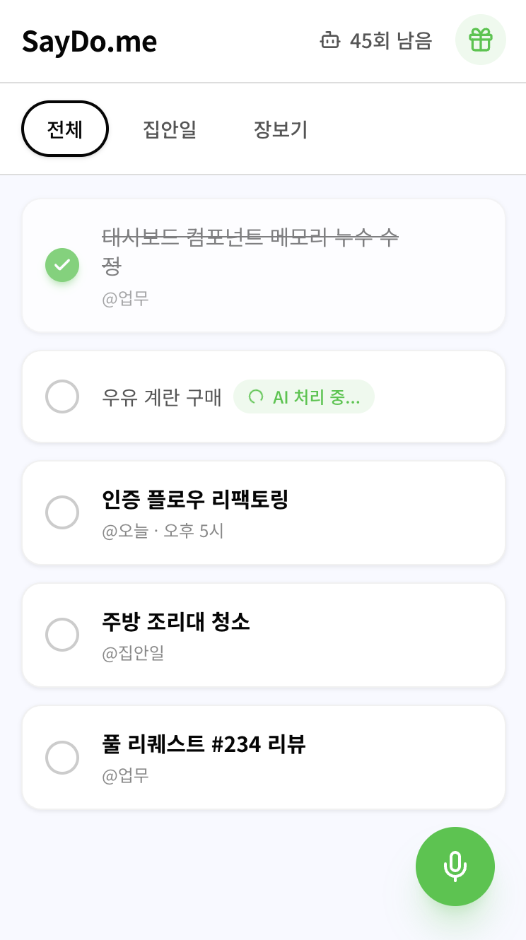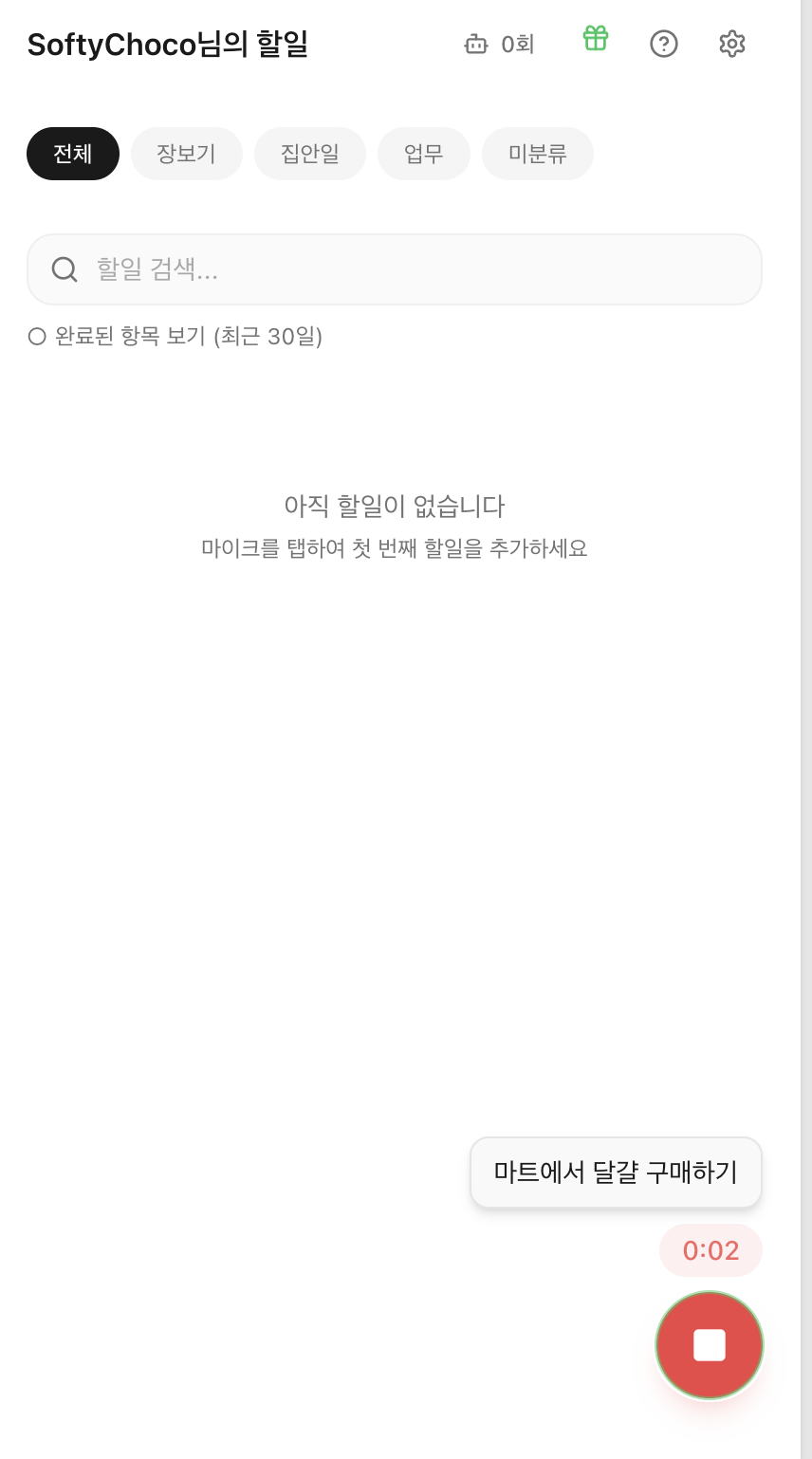 - 음성 녹음: 우측 하단의 녹음 버튼(🎤)을 눌러 할일을 말하기
